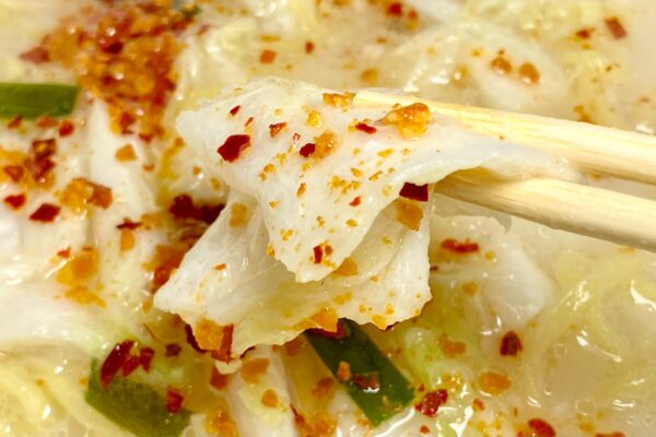 赤唐辛子についても単なる彩り的な要素ではなく、程よい辛さと風味のアクセントが味の見どころを増やし、こちらも違和感なくスープに調和。しかしながら今回は「液体スープ」単体の出来が素晴らしかったので、まずはストレートに背脂の芳ばしさや塩味のコントラストを堪能し、冬のスタミナトッピングは味変的に使うのがベストかと。