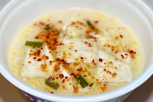 そのデカギリ白菜を適切に戻すため、できるだけ熱湯をFDブロックに当てながら内側の線まで注ぎ、フタの上で「液体スープ」を温めながら待つこと5分。時間になったら “まずはノンフライ麺をほぐし„ それから「液体スープ」を加えて混ぜ合わせ、仕上げに「冬のスタミナトッピング」をふりかけたら出来上がり。