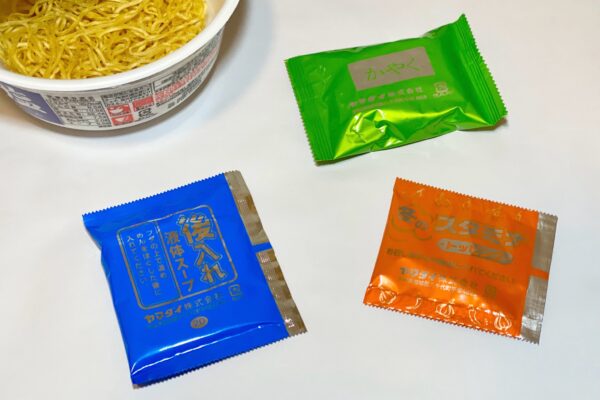 今回のカップ麺に別添されている小袋は、先入れの「かやく」に、後入れ「液体スープ」と「冬のスタミナトッピング」の組み合わせで、かやくの小袋は凄麺ご当地シリーズの「奈良天理スタミナラーメン」と同じデザイン。これも19代目に共通するポイントになりますが、ちょっと卑怯なほどハイレベルなんですよね、ヤマダイのFD(フリーズドライ)ブロック。