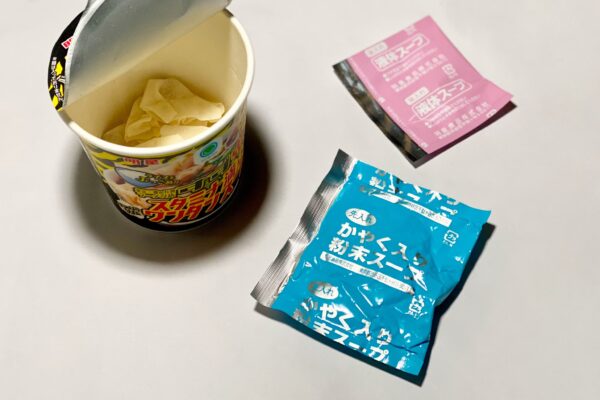 せっかくなので、カップスープの感想も少し。こちらは「粉末スープ(先入れ)」と「液体スープ(後入れ)」の組み合わせで、なるほど「すず鬼」監修らしい世界観が伝わってくるテイストではあるんですけど、前述したカップラーメンのスープとは別物。