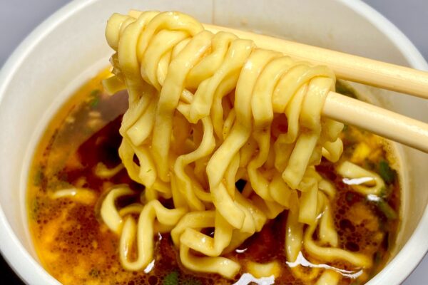 また製品の仕様上、大判どんぶり型のカップラーメンよりも制約が多い縦型ビッグなので、それを思うと充分に納得できる仕上がり。以上の特徴から「今だけタマゴ入り」と同じノンフライ麺だと思うのですが、スープとの兼ね合いか小麦の風味は比較的に控えめに感じます。ただ、後述するスープのインパクトに負けない存在感を放っていることは確実。熱湯5分+30秒ほどで “ワシワシ感„ が楽しめるので、長めに待つ必要はありません。