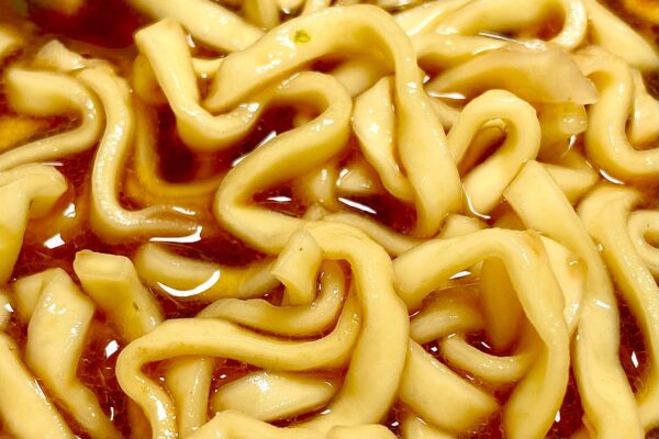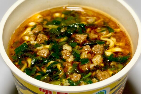 めんは油で揚げずに乾燥させたノンフライ麺で、湯戻し時間は長めの5分。調理前の佇まいと原材料名の並び[小麦粉(国内製造)、植物油脂、食塩、しょうゆ、たん白加水分解物、植物性たん白、酵母エキス、香辛料(ガーリック)]から察するに、直近の新作「今だけタマゴ入り」と同じ “ワシワシ麺„ を採用している可能大。
