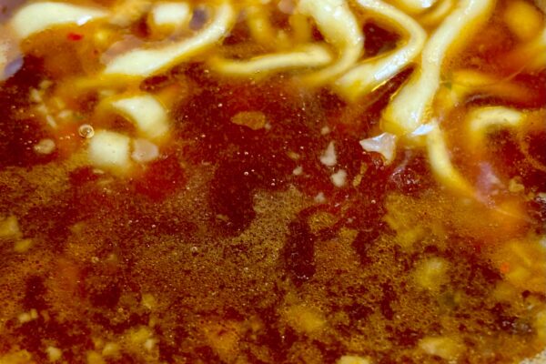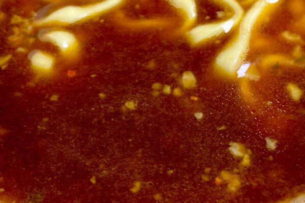 味の方向性は従来品と比較して大きく変わっておらず、最初から容器の中に入っている粉末スープは唯一無二のジャンクさを誇り、びっくりするほど濃いめのテイスト。なおかつガーリックパウダーの効き目も強烈で、ほんのちょっと来る唐辛子のアクセントがスタミナ感を押し上げている、バリバリ武闘派の面持ちなのですが‥‥