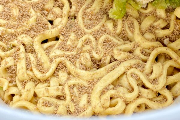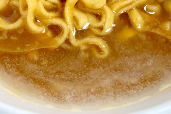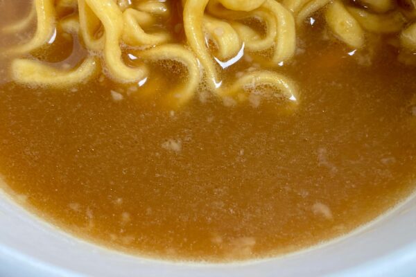 続けて「特製アブラ」を加えた途端、オイル特有のコクとアブラの風味がスープと豚骨の臨場感を底上げしてくるのですが、日清食品の二郎インスパイア商品にありがちな豚臭さや「大砲ラーメン」監修のムワッとくるオイルとも違う、大量の豚骨を強火で炊き出したときのニオイを彷彿とさせるアプローチ。レンジ麺ほどのインパクトではないけれど、重量よりも質で勝負してきたことが伝わってくる効果的な打ち出し方。