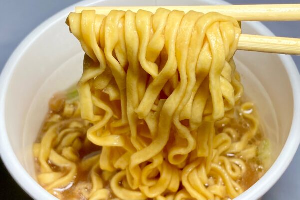 明星食品が力を入れている「麺神カップ」の極太ノンフライ麺に近い、うどんに見紛うほどの太さに切り出されているのですが、サイズに反して加水率は低く、外層から内層まで小さな気泡を残しているようなイメージ。かといってフカフカとした旧世代チックな頼りなさは皆無、むしろ噛み込むと内側から力強く押し返してくる反発性で食べ応えに寄与。
