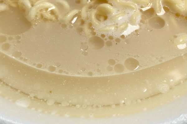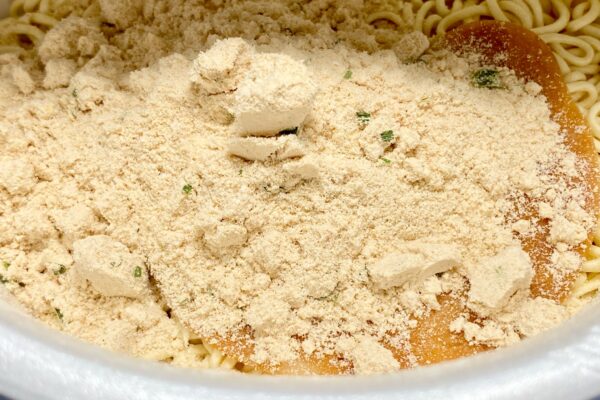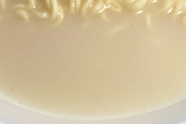 そして、忘れてはいけないのが「調味油」の存在。こちらは豚脂100%と思しき内容で、粉末だけでは出せない芳ばしさとオイル特有の厚みを与えてくれるアイテム。しかも他社のカップラーメンと比較して圧倒的に量が多いため、大盛りサイズでも最後まで豚脂の厚みが楽しめます。でも、ちょっとマイルドすぎないか‥‥? ってくらいクリーミーさに振り切っているので、好みによっては物足りなさを感じてしまうかもしれませんが——