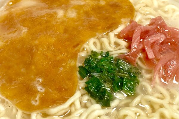 リニューアル前よりも麺の量が少なくなり、スープも比較的にマイルドな味わいになりましたが、ここまでクリーミーなスープは群雄割拠の即席カップめん業界においても稀有。さらに「焼豚ラーメン」らしい生タイプの紅しょうがだったり、揚げ油のラードに由来する芳ばしさだったり、それらも完璧に調和しているため、これといって文句の付け所が見当たりませんでした。
