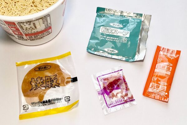 今回のカップ麺に別添されている小袋は、先入れの「焼豚」と「粉末スープ」に、後入れ「調味油」と「紅しょうが」の組み合わせで、この商品に限った話ではないんですけど、あいかわらず粉末スープの量が多くてニンマリ。それと調味油がパンパンに充填されている、というのもサンポー食品らしい “こだわり„ のポイント。